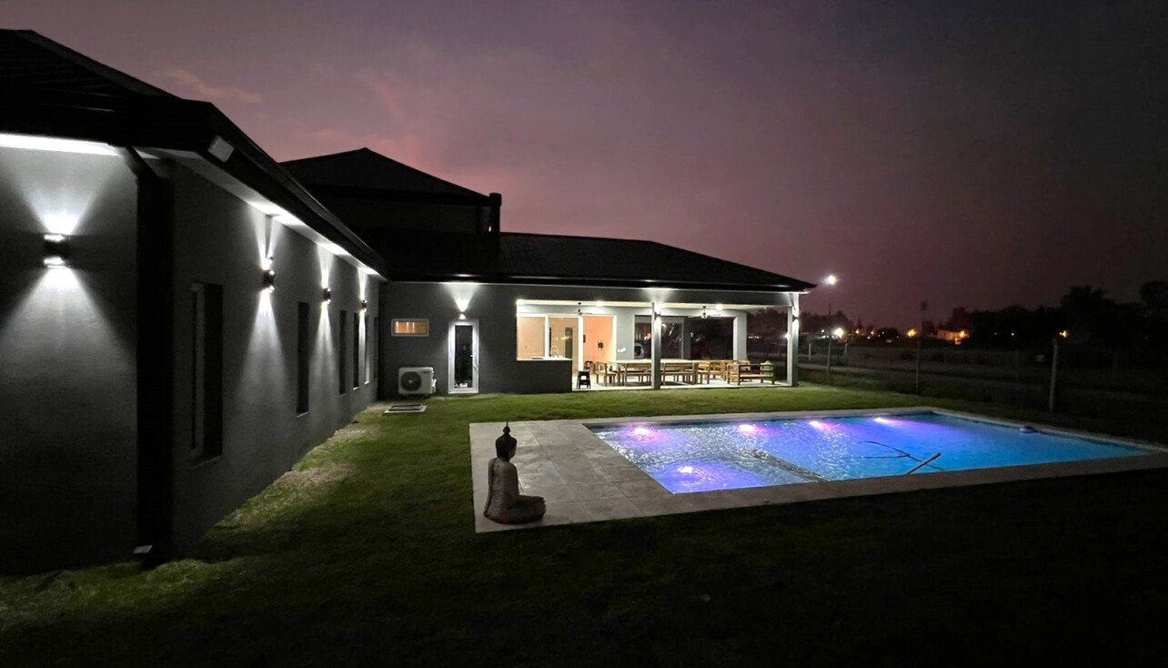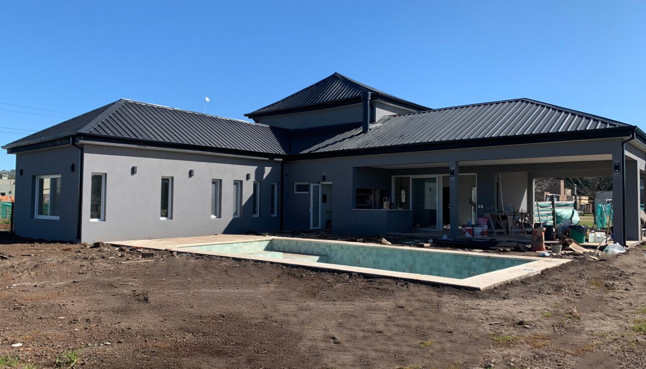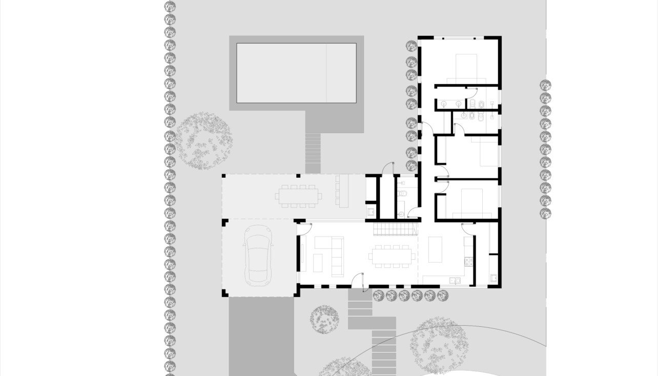 Este núcleo social se expande hacia una galería cubierta, que funciona como nexo entre el interior y el paisaje, culminando en un jardín con piscina que refuerza la conexión con el exterior.
