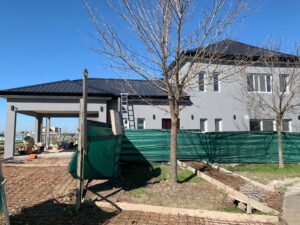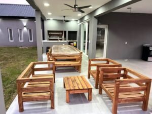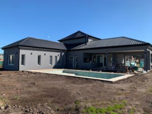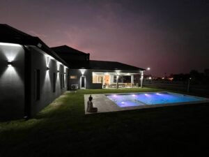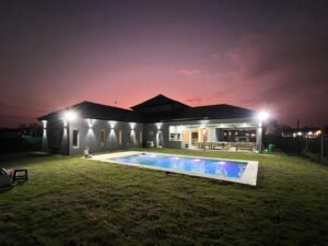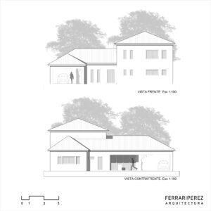 Este núcleo social se expande hacia una galería cubierta, que funciona como nexo entre el interior y el paisaje, culminando en un jardín con piscina que refuerza la conexión con el exterior.