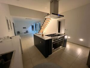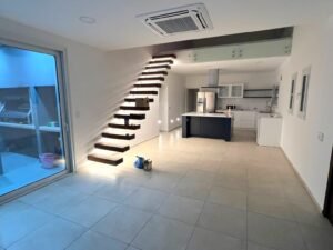 El primer módulo se caracteriza por su fluidez espacial, generada a través de variaciones en altura y transiciones entre el interior y el exterior. Desde el estar, el recorrido se extiende hacia el comedor y la cocina integrados, mientras que un playroom, ubicado sobre la cocina, balconea hacia el comedor, aportando dinamismo y continuidad visual.